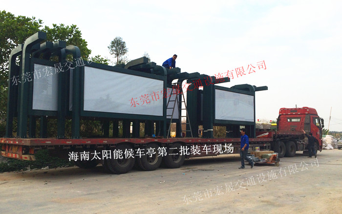 海南太陽能公交候車亭廠家裝車圖片及現(xiàn)場安裝的太陽能候車亭圖片: