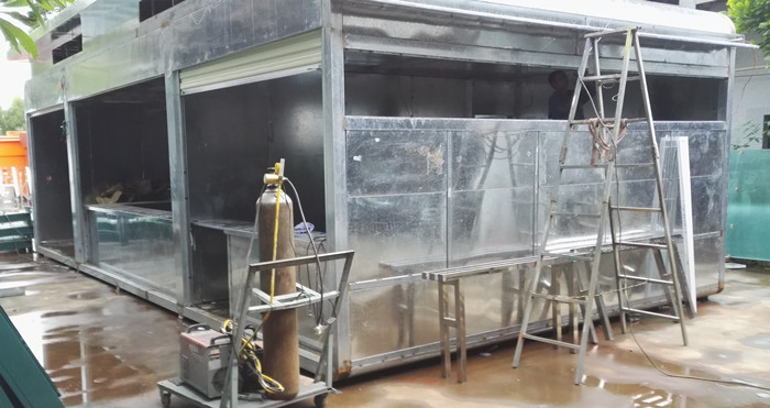 東莞市籃球中心彩票售貨亭尺寸:5.0*10.0*3.5米,整個(gè)亭子是到現(xiàn)場(chǎng)拼裝的,材料采用鋼結(jié)構(gòu)焊接成型,整體分為三個(gè)部分,運(yùn)輸?shù)浆F(xiàn)場(chǎng)拼接而成,亭子分為兩部分,一部分用來彩票銷售,另一部分為零售小店。