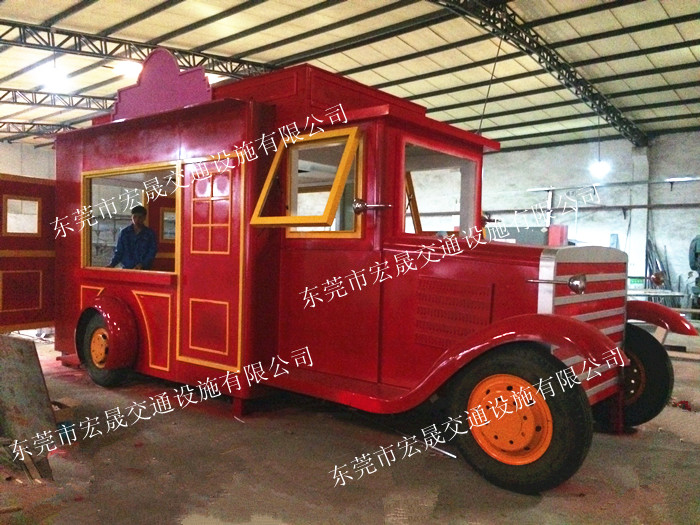 此款拖掛式移動(dòng)售貨亭按照老爺車的外形設(shè)計(jì),整體美觀、大方,再加上紅色的戶外氟碳漆,更是高端大氣,上檔次。